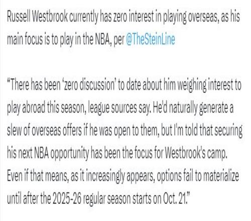 北京时间10月13日,距离新赛季开打还有9天,9届全明星威少仍未加盟任何球队,据名记Marc Stein报道,自由球员威少目前不愿意前往海外打球,专注回归NBA。