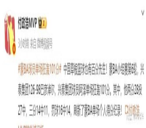 最近几年,随着篮球的崛起,不少省份、市区,甚至是乡镇都开始玩起“X”BA了。除了大火特火的村BA外,近日,蒙BA也正式打开了。目前,已经进行到第6轮了。原本,这也只是少数人关注的一项赛事。不过,正所谓也是低级的联赛,便越有可能创造纪录。在过去,这种级别的联赛,除了单场最大分差缔造者外,也是单场得分纪录的缔造者。尤其是随着职业球员参赛后,这数据更是被不断刷新。
