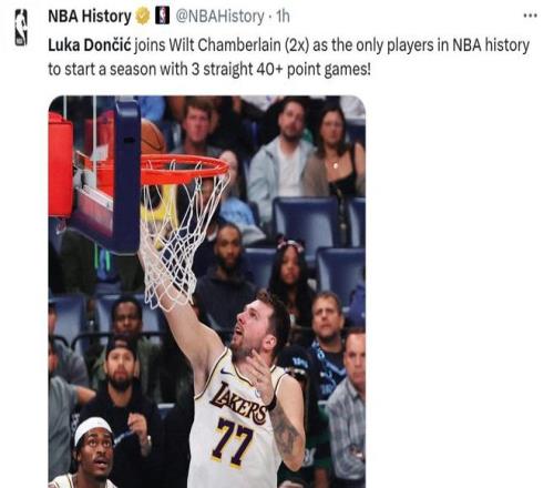 凭借这样的表现,东契奇成为张伯伦后NBA历史上第二位能够在开季至少三场比赛中连续交出40+得分的球员,张伯伦曾在61-62赛季和62-63赛季连续两个赛季做到这一壮举。